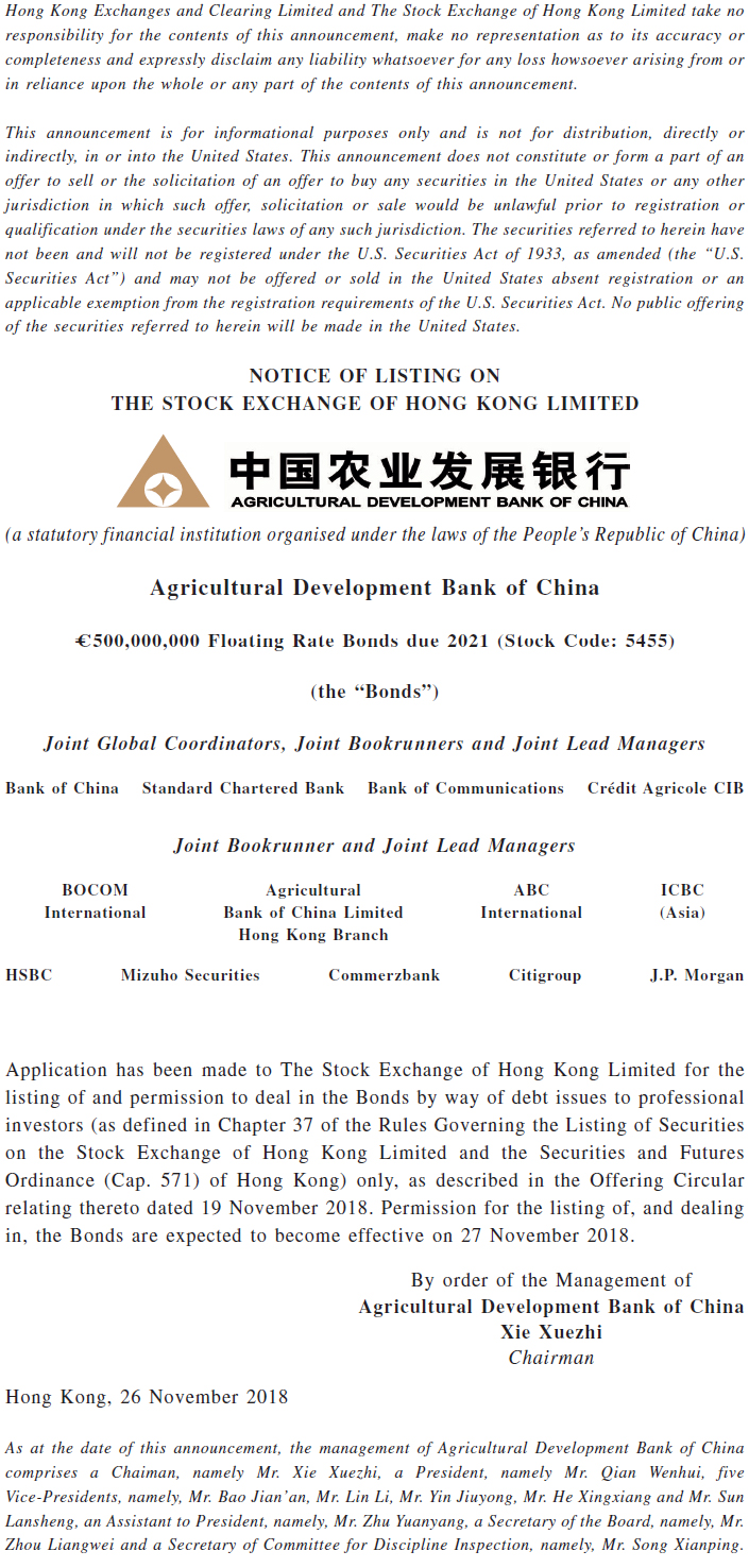 NOTICE OF LISTING ON THE STOCK EXCHANGE OF HONG KONG LIMITED